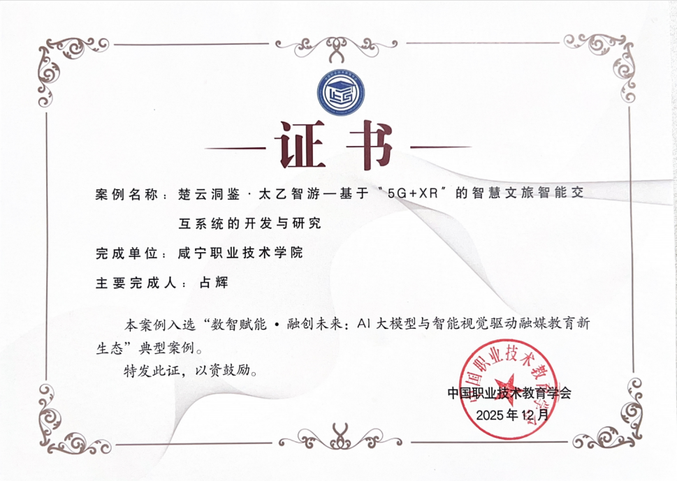 近日,中国职业技术教育学会“数智赋能·融创未来:AI大模型与智能视觉驱动融媒教育新生态”典型案例评选结果正式揭晓,我校信息工程学院人工智能技术应用专业教师占辉主持完成的《楚云洞鉴·太乙智游—基于“5G+XR”的智慧文旅智能交互系统的开发与研究》案例,从全国众多参评项目中脱颖而出,成功入选本次国家级典型案例。本次典型案例征集活动由中国职业技术教育学会主办,中国职业技术教育学会智能融媒体专业委员会承办,清华大学新闻与传播学院、北京航空航天大学计算机学院提供专业指导,是我国职业教育领...