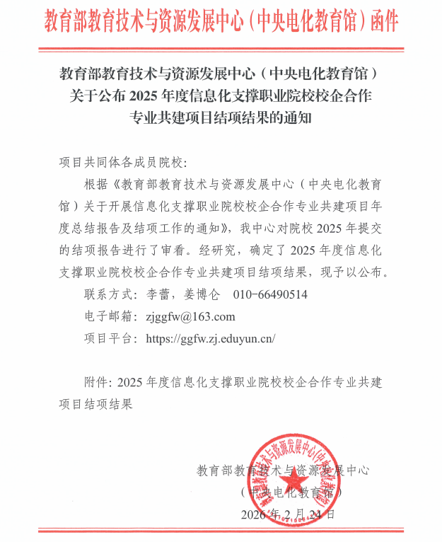 09 | 2026-03近日,教育部教育技术与资源发展中心(中央电化教育馆)发布了《关于公布2025年度信息化支撑职业院校校企合作专业共建项目结项结果的通知》。我校申报的“信息化支撑校企合作专业共建项目”顺利通过结项验收,标志着我校在“全国信息化标杆校”的创建过程中又迈出了坚实而有力的一步。据悉,教育部教育技术与资源发展中心(中央电化教育馆)组织开展的信息化支撑职业院校校企合作专业共建项目,旨在以数字化赋能职业院校校企合作与专业共建,重点提升院校职业教育专业能力和专业实力,更好地服务国家战略发展。项目...