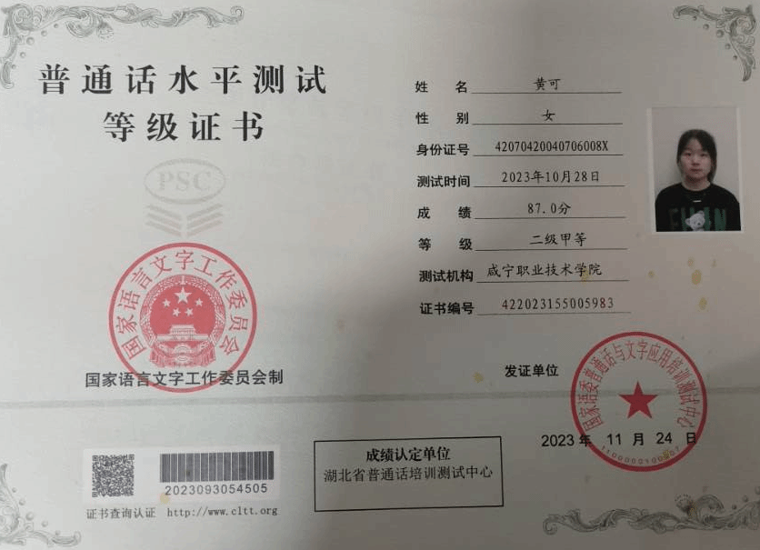 自踏入咸宁职业技术学院的校门,她便为自己定下了清晰的学习目标——夯实专业基础,考取实用证书,为未来发展积蓄力量。她主动挑战英语四级考试,每天坚持晨读背单词、晚上刷题练听力,克服了英语学习的畏难情绪,最终顺利通过;面对中小学教师资格证的严苛考核,她系统梳理教育学、心理学知识点,反复打磨试讲流程,凭借扎实的专业功底和从容的临场表现成功获证;此外,她还考取计算机二级证书、普通话二甲证书,用硬核实力为自己的简历增添亮色。扎实的学习态度让她连续两个学年斩获国家励志奖学金,成为同学们眼中“靠谱又优秀”的学习榜样。
