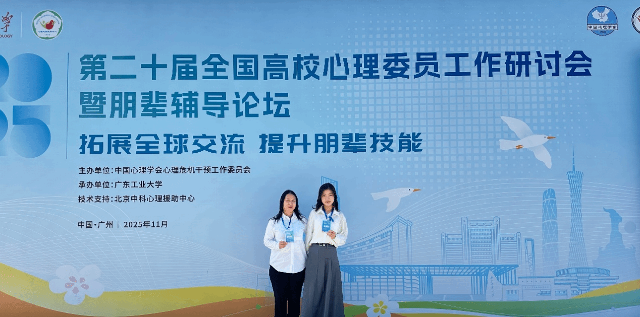 近日,第二十届全国高校心理委员工作研讨会暨朋辈辅导论坛在广东工业大学圆满落幕。大会围绕“拓展全球交流,提升朋辈技能”的主题,展开了深入的交流与探讨,共同致力于推动高校心理育人及朋辈辅导工作的高质量发展。建筑学院心理专干张华容老师和学生心理委员代表杨可有幸参加了此次盛会,杨可同学凭借其出色的工作表现和卓越的心理健康教育工作能力,入选“全国百名心理委员风采展”。