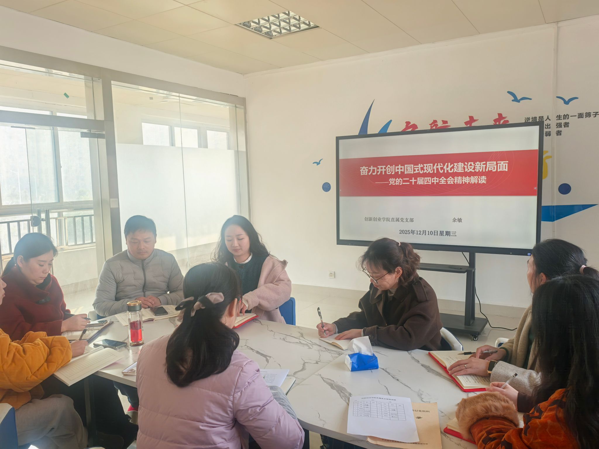 为深入学习贯彻党的二十届四中全会精神,推动创新创业教育与国家战略、地方发展同频共振,12月10日,创新创业学院直属党支部在学院会议室开展专题党课学习。党支部负责人余敏以 “奋力开创中国式现代化建设新局面——党的二十届四中全会精神解读”为主题,为10名党员教职工带来一堂理论扎实、贴合实际的专题宣讲。