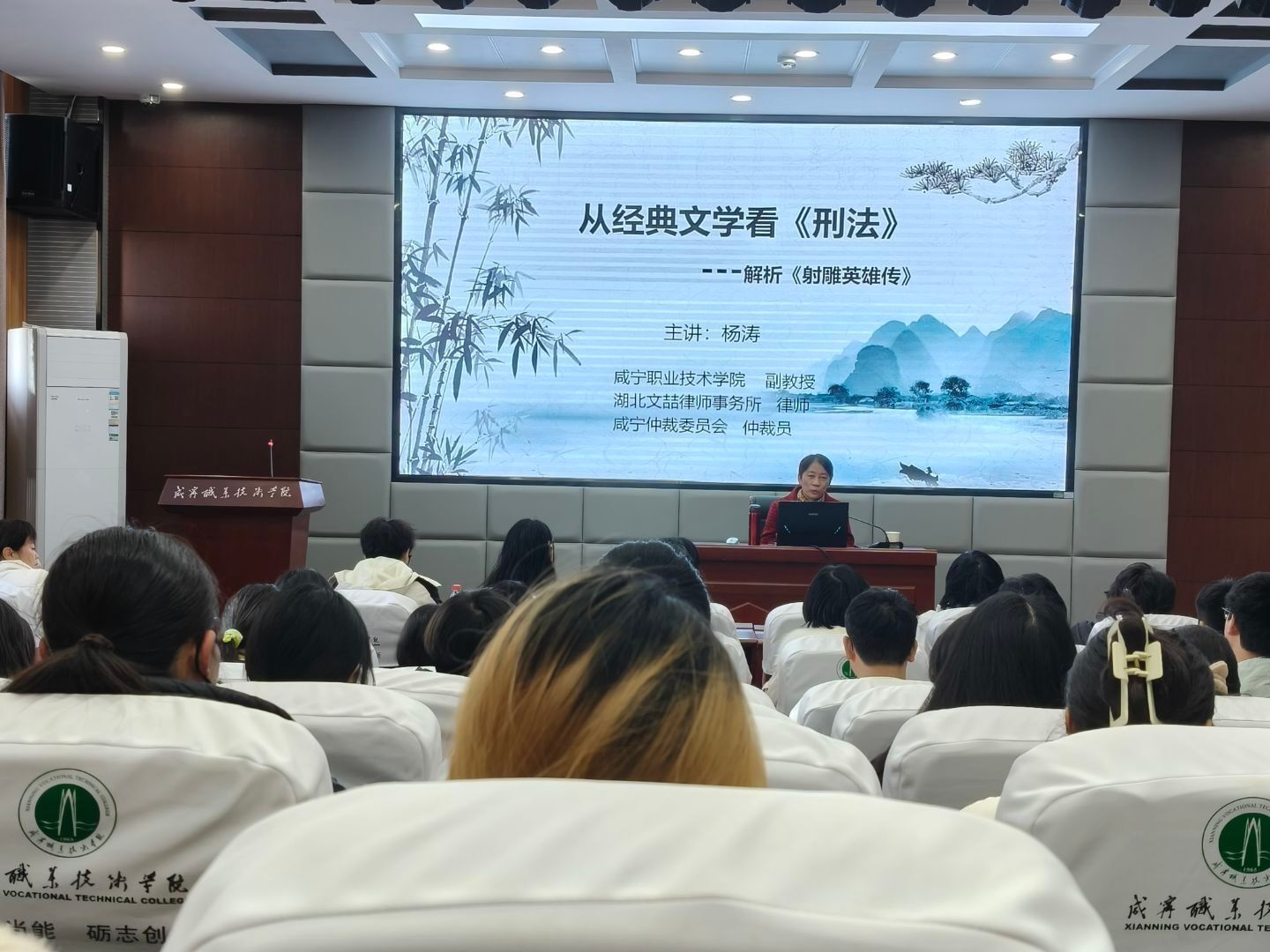 2025年12月3日,咸宁职业技术学院教育实训中心201举行了一场别开生面的讲座:“从经典文学看《刑法》——解析《射雕英雄传》”。本次活动由校团委主办,读书协会、笛萧古风协会承办,荣幸邀请到了咸宁职业技术学院副教授、湖北文喆律师事务所律师、咸宁仲裁委员会仲裁员杨涛教授为我们进行讲授,读书协会、笛萧古风协会、语言文字工作者协会的同学们齐聚,共同参与此次法律知识的学习。
