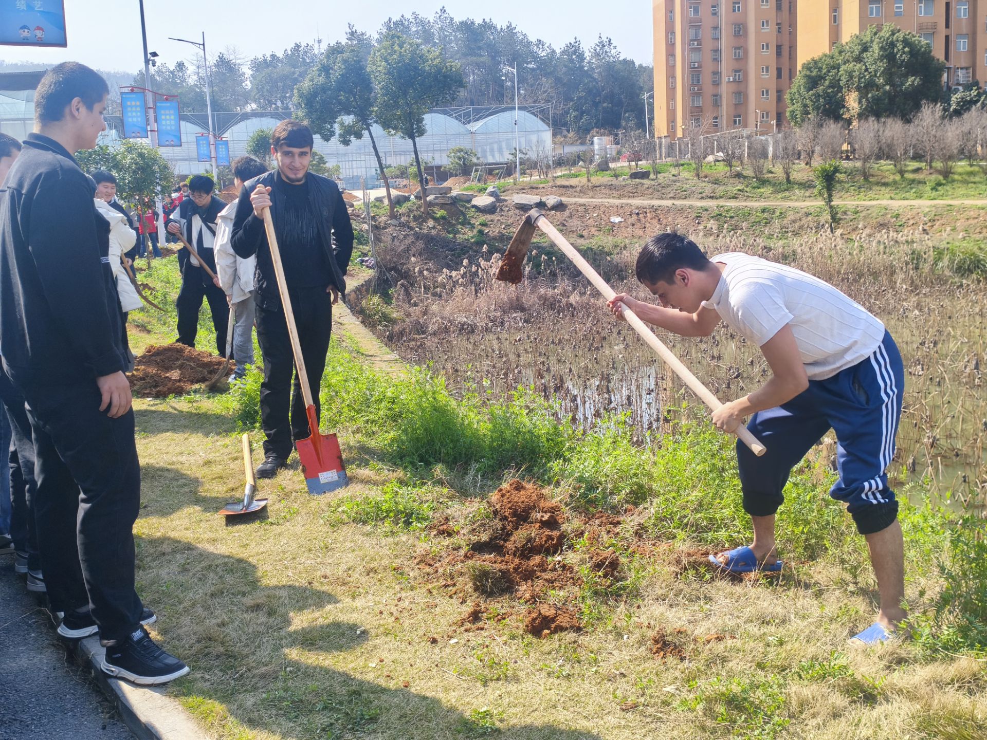 活动现场,师生们热情饱满、分工协作。校领导率先垂范,与中外同学一同挥锹挖坑、扶苗培土、浇水定根,细致完成每一道工序。同学们默契配合,干劲十足,挖坑、扶树、填土、浇水,动作娴熟有序。大家在劳动中交流互动,欢声笑语不断,亲手栽下的株株树苗,成为春日校园里一道靓丽的风景线,也让绿色理念与跨国友谊在协作中生根发芽。