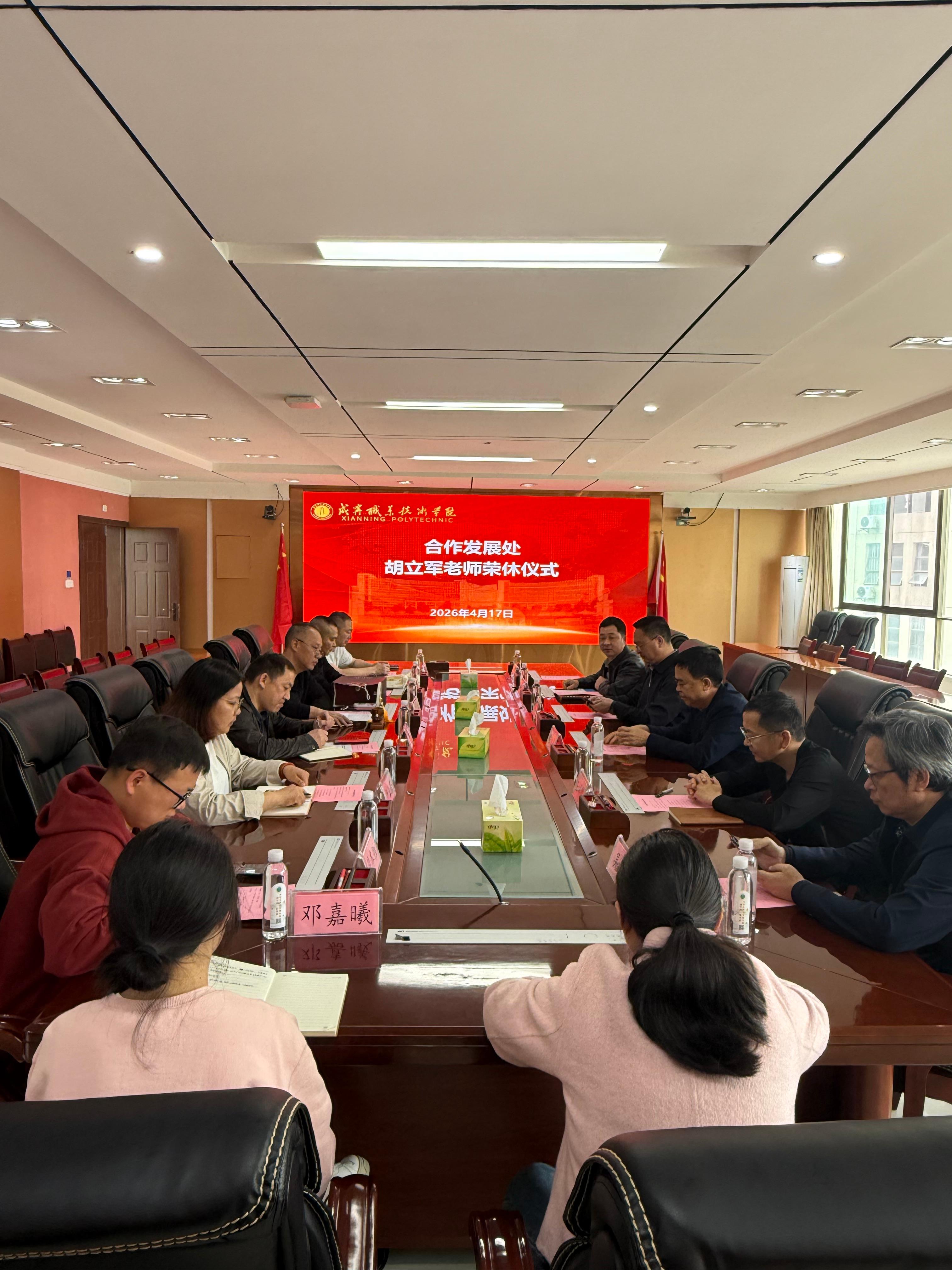 岁月流转,薪火相传。为致敬为学校事业默默耕耘数十载的老教师,2026年4月17日,咸宁职业技术学院合作发展处为胡立军同志举办了一场温馨而庄重的荣休仪式。学校党委委员、副校长方高文出席仪式并讲话,校工会主席吴虓、离退休工作处副处长雷强,合作发展处全体班子成员及教职工代表齐聚一堂,共同回顾胡立军同志的奋斗历程,献上最诚挚的敬意与祝福。仪式由合作发展处处长赵德良主持。
