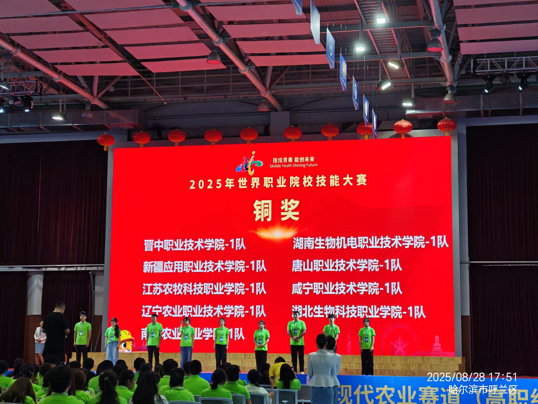 8月25-28日,在黑龙江农业工程职业学院举办的世界职业院校技能大赛总决赛争夺赛现代农业赛道高职组中,我院学生张小琴、黄琦、倪礼冲、李豪组成的团队,凭借扎实的专业知识、精湛的实操技能和出色的团队协作斩获铜奖。