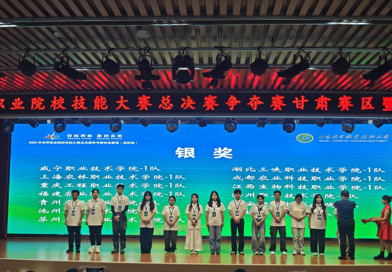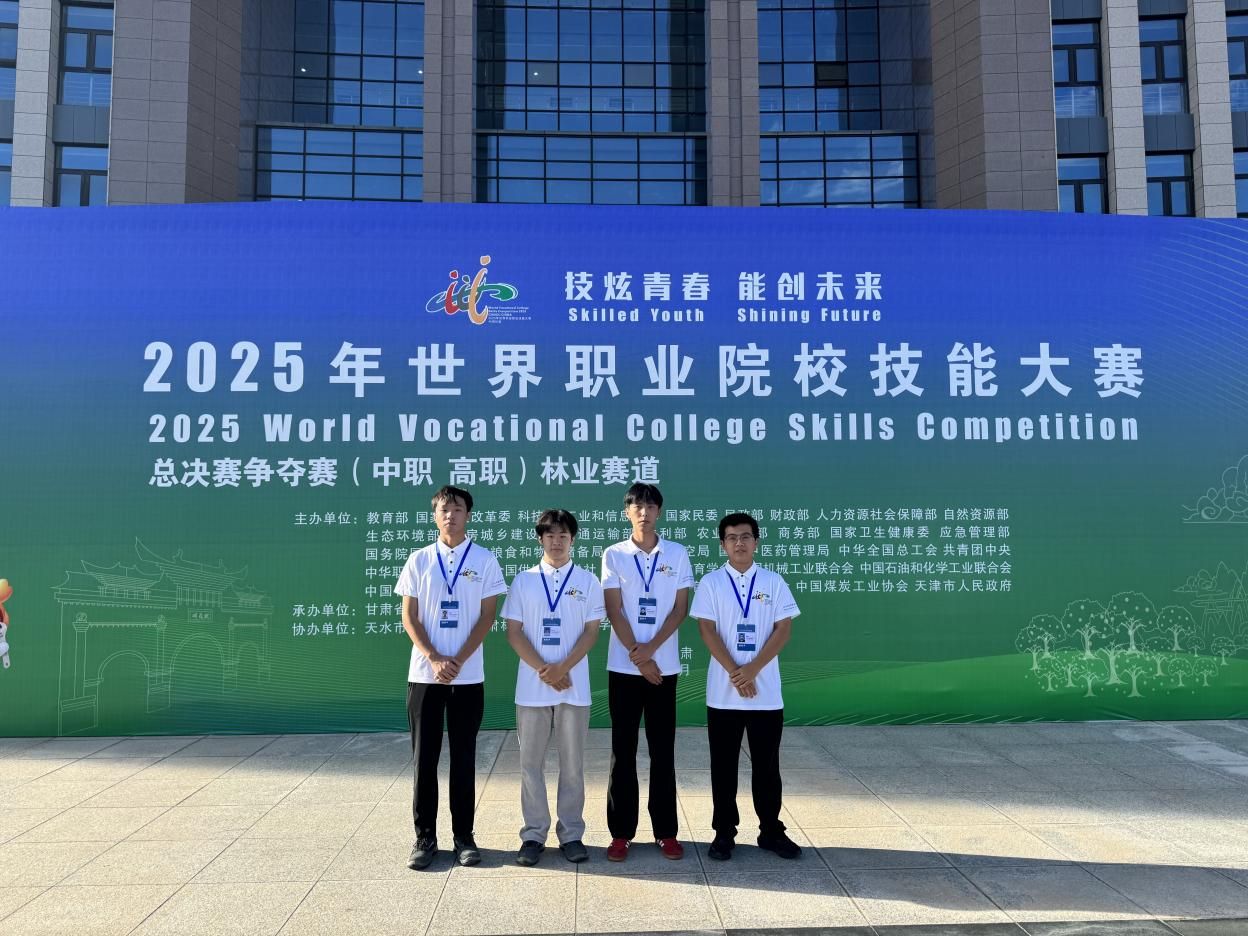 8月26日至29日,世界职业院校技能大赛总决赛争夺赛林业赛道(高职组)在甘肃林业职业技术大学圆满举办。来自全国80余所高职院校的340名选手同场竞技,切磋技艺、比拼实力。我校生物工程学院2023级园林技术专业学生黄俊儒、张以锦、刘利源、郭鑫广组成的代表队发挥出色,荣获银奖佳绩。