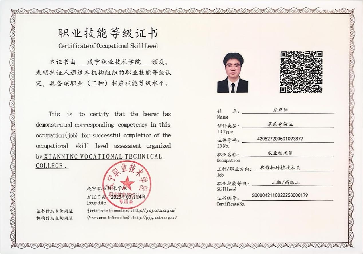 技能认证是实力的最好佐证。2024年11月,他考取粮农食品安全评价职业技能等级证书(中级);2025年3月,又拿下农作物种植技术员职业技能等级证书(三级/高级工),用过硬资质为职业道路铺路。