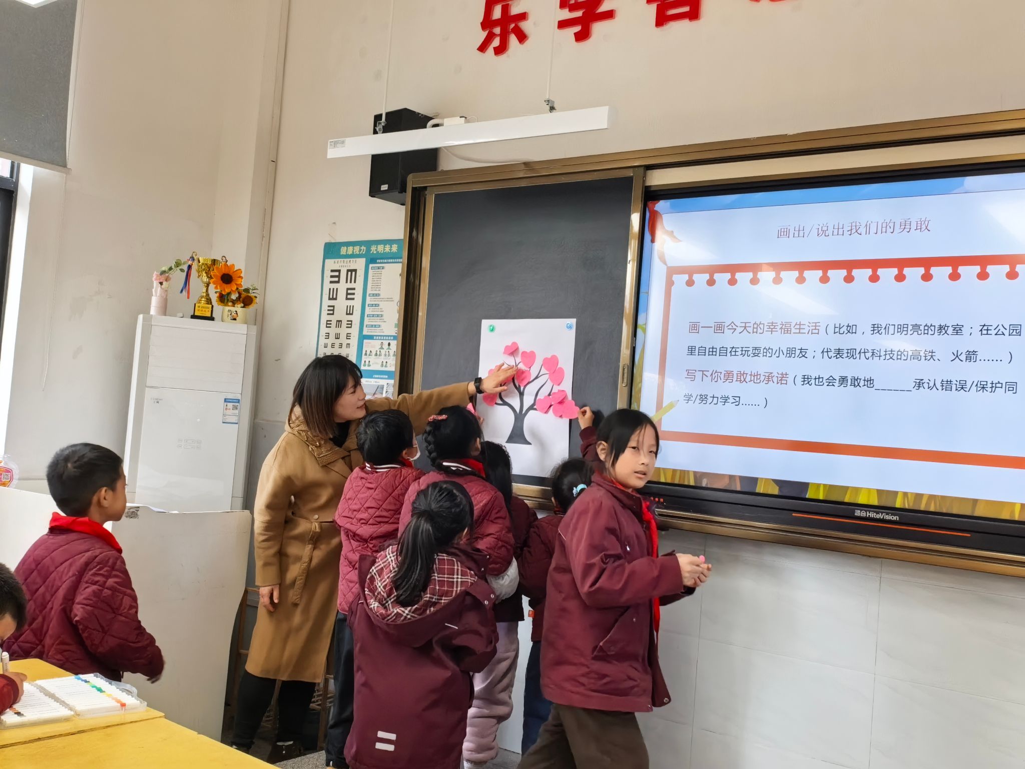 为打破传统宣讲的单向输出模式,解维娟老师设计了多个沉浸式互动环节,让孩子们在参与中深化认知、引发共鸣。在“守护我的小信念”环节,面对“朋友考试想抄答案”的情景,教师引导学生用“我知道…… 是正确的,所以我会像何叔叔一样,勇敢地……”的句式分享想法,将英雄精神与日常行为规范相结合;在“艰难的选择”互动中,通过“轻拍桌子”与“用力跺脚”的动作选择,让孩子们亲身体会英雄在个人情感与革命大义间的艰难抉择,深刻理解何谓真正的勇敢。课堂尾声,教师还鼓励大家用书画描绘如今的幸福生活、写下勇敢的承诺,让红色精神转化为具体的行动自觉。