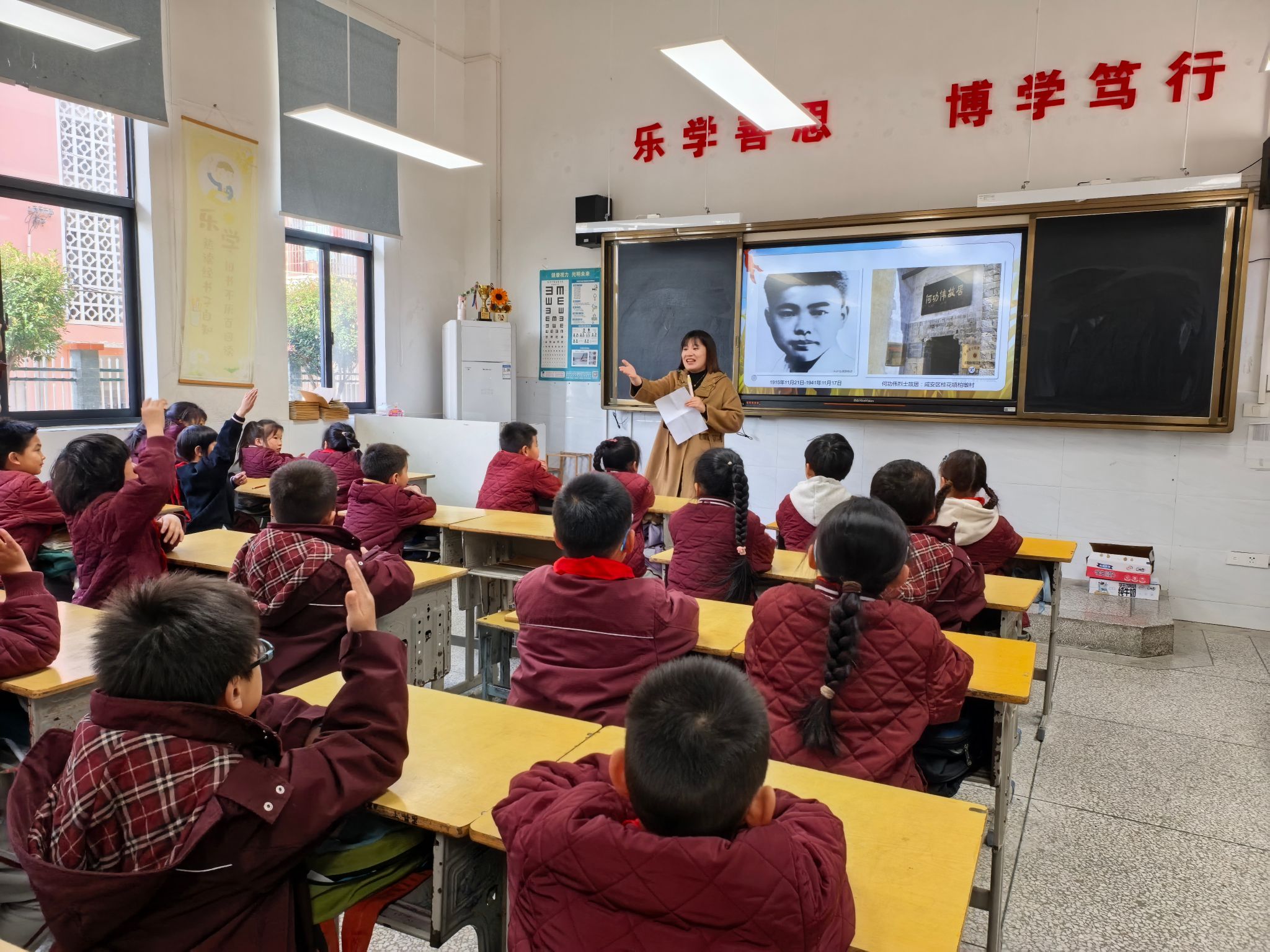 为深入推进大中小学思政课一体化建设,充分发挥高校在思政教育中的引领辐射作用,11月18日下午,我校思政课教师解维娟受邀前往咸宁实验外国语玉泉小学,为201班40余名学生带来一堂以“三封家书见勇敢——英雄何功伟的故事”为主题的红色思政讲堂。此次活动以本土英雄事迹为纽带,搭建起大中小学思政教育衔接桥梁,让红色基因在孩子们的心田深深扎根,为思政课一体化建设注入鲜活力量。