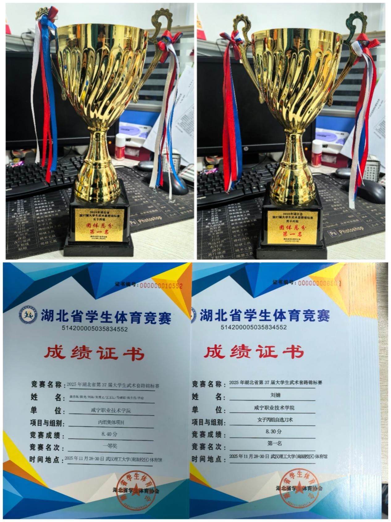 11月30日,2025年湖北省第37届大学生武术套路锦标赛在武汉理工大学落下帷幕。学校武术队派出8名运动员参赛,经过激烈的角逐,斩获个人项目9金5银1铜、集体项目一等奖、男子团体和女子团体总分双双取得丙组(高职高专组)第一名的好成绩。