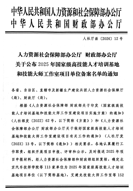 近日,人社厅函【2026】12号文,国家人力资源和社会保障部、财政部公布2025年国家级高技能人才培训基地建设项目名单,咸宁职业技术学院成功入选,标志着学校高技能人才培养工作迈上国家级新台阶。