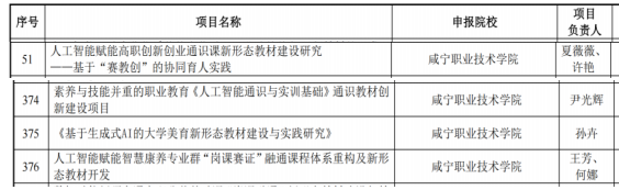 依据《2026年度数字化与人工智能背景下职业教育教学改革及教材建设创新研究项目公示》(信息化教指委〔2026〕15号),我校4个项目顺利获批立项,其中“人工智能赋能高职创新创业通识课新形态教材建设研究——基于‘赛教创’的协同育人实践”获评重点项目,为湖北省高职院校唯一,其余3项为一般项目,研究方向涵盖人工智能通识教育、大学美育、智慧康养专业群课程体系重构等关键领域,进一步夯实了我校在职业教育教学创新研究方面的优势地位。